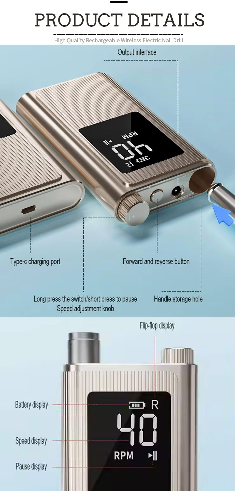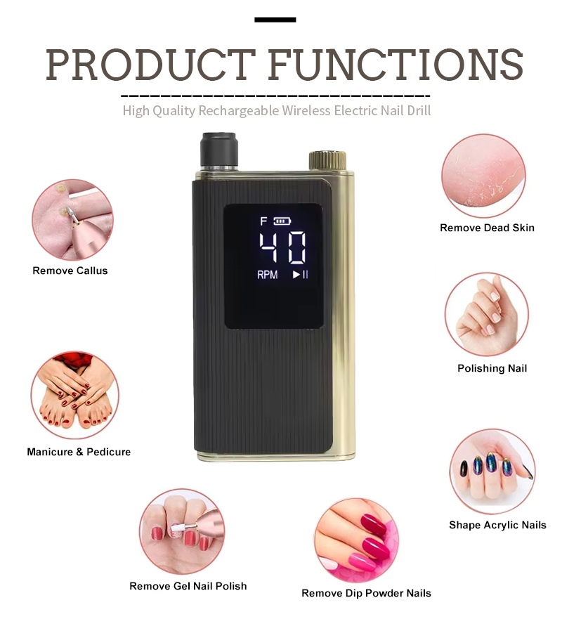 Apẹrẹ ifihan ti 40,000 rpm iyara eekanna ọjọgbọn ti o ga julọ ni iyipada titan / pipa ati yiyi siwaju / yiyi pada fun apapọ ti iṣiṣẹ-bọtini kan, gbigba agbara iyara ni isalẹ, iho rọrọpo ti o rọpo ni oke, ati iyara adijositabulu ipo mẹta lati pade ọpọlọpọ awọn iwulo.