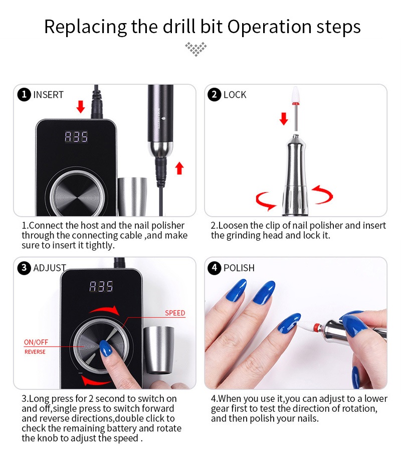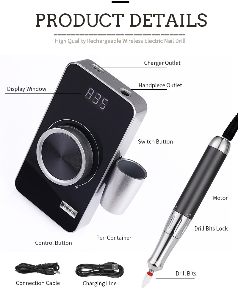 Apẹrẹ ifihan ti exfoliating yii 35,000 rpm eekanna eekanna ina ni iyipada titan / pipa ati yiyi siwaju / yiyi pada fun apapọ bọtini kan ti a ti mu ṣiṣẹ, iho gbigba agbara ni kiakia ni isalẹ, ibọsẹ adaṣe ti o rọpo ni oke, ati iyara adijositabulu ipo mẹta lati pade ọpọlọpọ awọn iwulo.
