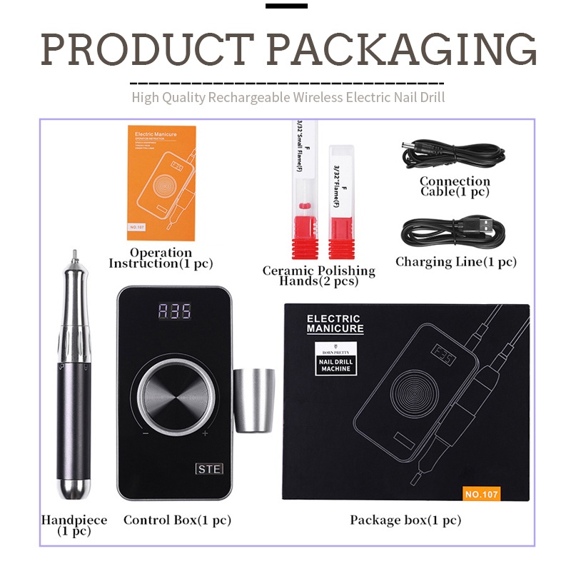 Awọn akoonu ti exfoliating yi 35,000 rpm ina àlàfo lilu package ni o ni a sanding pen ọja, USB gbigba agbara USB, a ọja itọnisọna, ati ki o kan lightweight ati ki o gbe apoti.