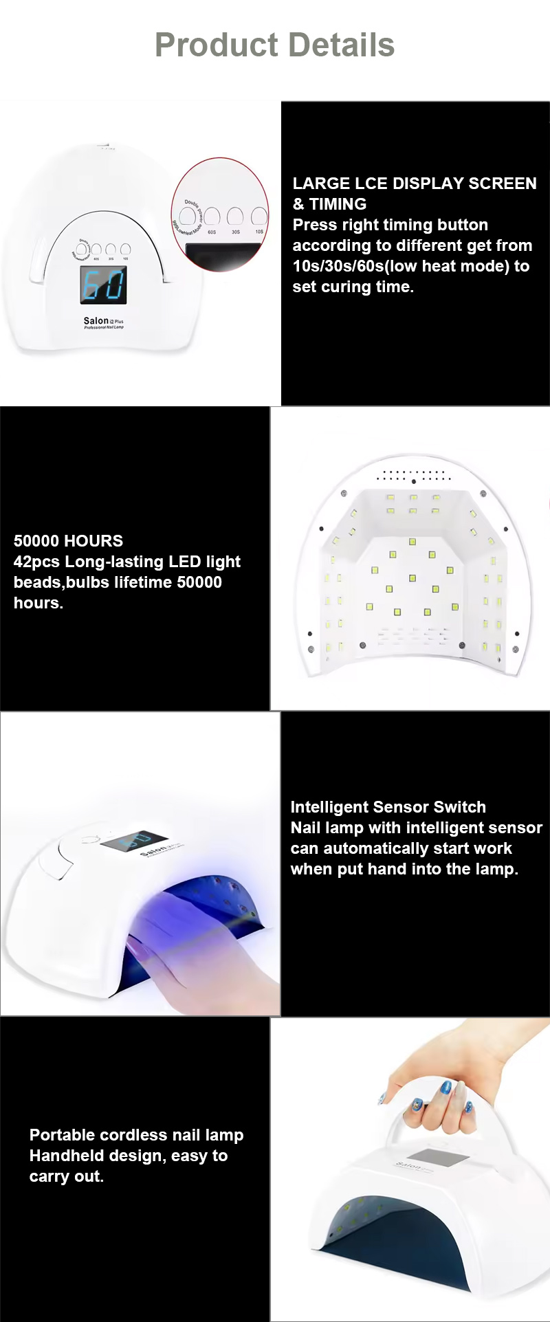 Ọja naa ṣe idaniloju paapaa gbigbẹ lẹ pọ laisi idinku. Awọn orisun ina meji rẹ pese alapapo onírẹlẹ lati ṣe idiwọ iyipada ọwọ ati igara oju, o dara fun ọwọ ati ẹsẹ mejeeji, jiṣẹ awọn abajade gbigbẹ iyara ti iyalẹnu.