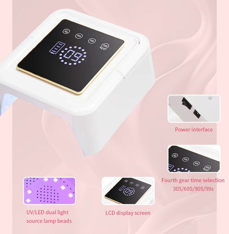 Yi ga-giga àlàfo pólándì àlàfo jeli awọn ọna-gbẹ atupa idaniloju ani lẹ pọ gbígbẹ lai isunki. Awọn orisun ina meji rẹ pese alapapo onírẹlẹ lati ṣe idiwọ iyipada ọwọ ati igara oju, o dara fun ọwọ ati ẹsẹ mejeeji, jiṣẹ awọn abajade gbigbẹ iyara ti iyalẹnu.