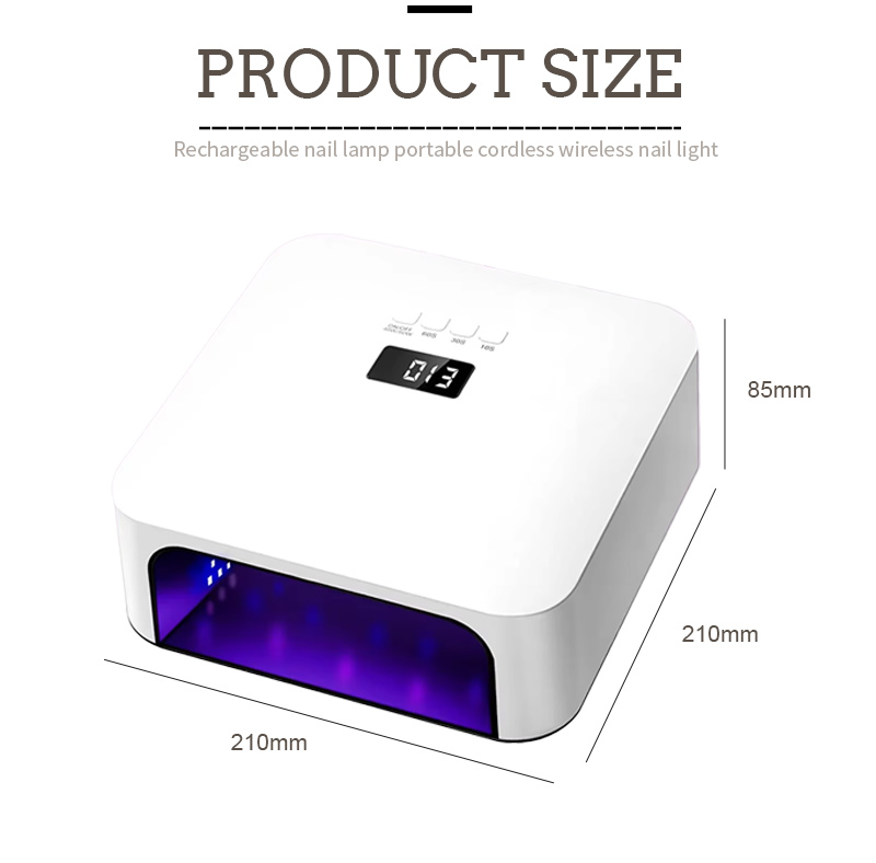 Awọn iwọn ti atupa gbigbẹ eekanna iyara ti o ga julọ jẹ 210 mm ni ipari, 210 mm ni iwọn ati 85mm ni giga, pẹlu agbara nla ati agbara lati lo awọn ọwọ ati ẹsẹ mejeeji, eyiti o rọrun pupọ.