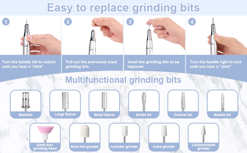 Apẹrẹ ifihan ti ohun elo eekanna eekanna to šee gbe ariwo kekere ni iyipada titan / pipa ati yiyi siwaju / yiyi pada fun apapọ ti imuṣiṣẹ bọtini kan, iho gbigba agbara ni iyara ni isalẹ, iho iho rọrọpo ni oke, ati iyara adijositabulu ipo mẹta lati pade ọpọlọpọ awọn iwulo.
