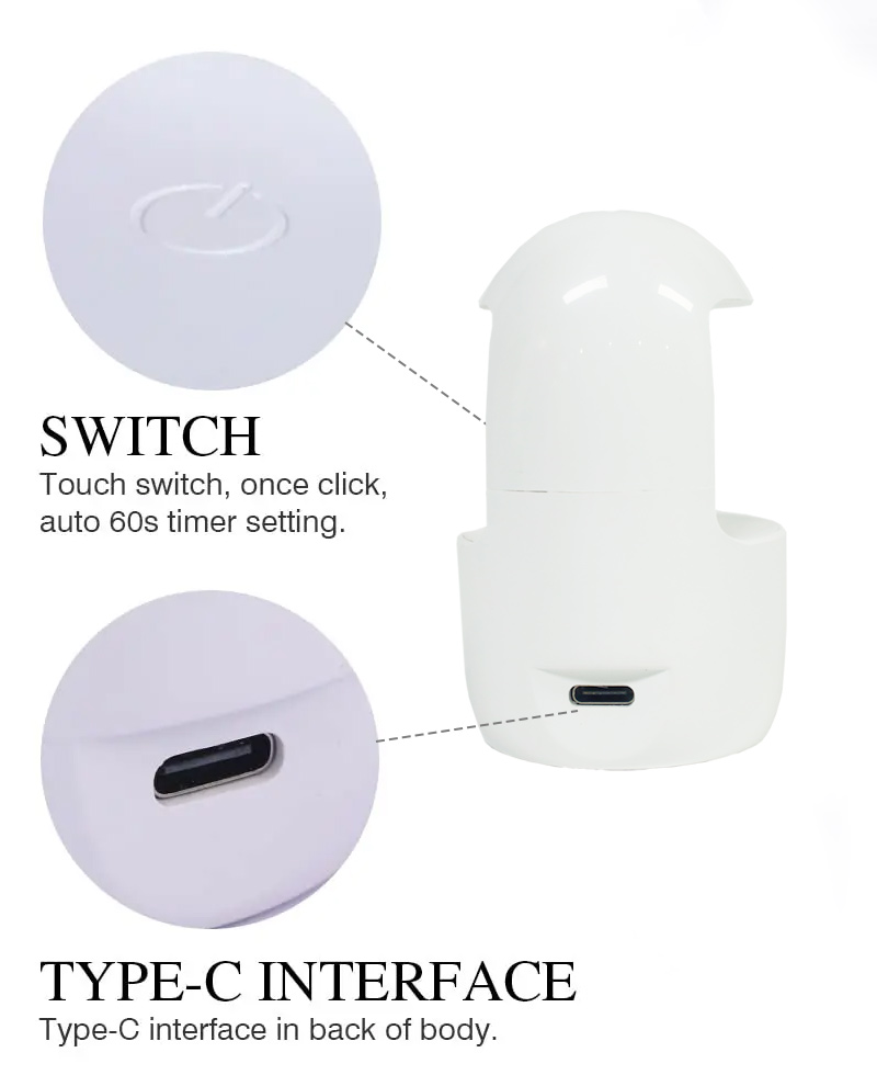 Atupa eekanna ika-kekere Kan ṣe idaniloju paapaa gbigbẹ lẹ pọ laisi isunki. Awọn orisun ina meji rẹ pese alapapo onírẹlẹ lati ṣe idiwọ iyipada ọwọ ati igara oju, o dara fun ọwọ ati ẹsẹ mejeeji, jiṣẹ awọn abajade gbigbẹ iyara ti iyalẹnu.