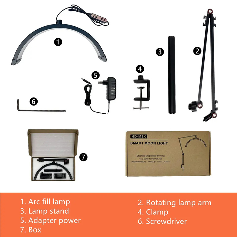 Atokọ iṣakojọpọ ọja ni ipilẹ, idaji oṣupa arc lampshade, okun asopọ, bọtini atunṣe, ipese agbara, tube akọmọ.