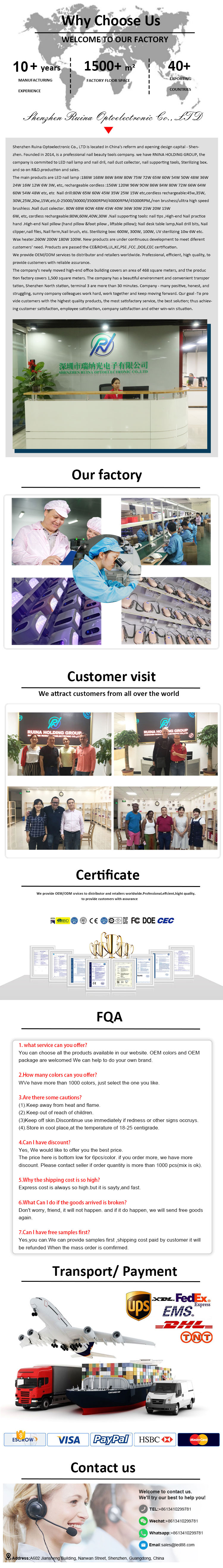 한국어Shenzhen Ruina Optoelectronics Co., Ltd., gẹgẹbi olupilẹṣẹ asiwaju ti Ilu China, olupese, ati atajasita ti atupa eekanna pẹlu iṣẹ aago, nigbagbogbo ṣe atilẹyin imoye ti ilepa didara pipe. Ifaramo yii ti gba awọn atupa eekanna eekanna UV lilo ile ni igbẹkẹle ti awọn alabara lọpọlọpọ. Apẹrẹ alailẹgbẹ, awọn ohun elo aise ti Ere, iṣẹ ṣiṣe to dayato, ati idiyele ifigagbaga pupọ — iwọnyi jẹ deede ohun ti gbogbo alabara nireti, ati ohun ti a fi jiṣẹ. Nitoribẹẹ, okeerẹ iṣẹ-tita lẹhin-tita jẹ bakanna ko ṣe pataki.