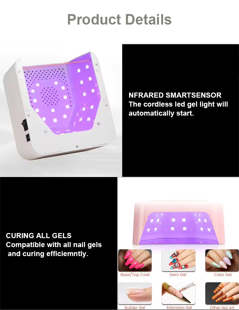 Awọn ọja akọkọ wa pẹlu awọn atupa eekanna LED: 186W/168W/86W/84W/80W/75W/72W/65W/60W/54W/50W/48W/36W/24W/16W/12W/6W/3W, etc. Awọn awoṣe alailowaya gbigba agbara: 156W / 120W / 96W / 90W / 86W / 84W / 80W / 72W / 66W / 64W / 60W / 54W / 48W bbl 25W, 20W, 15W, bbl Full eruku-odè. 80W/68W/60W/48W/45W/40W/36W/30W/25W/20W/15W/6W ati be be lo, Awọn awoṣe gbigba agbara Alailowaya: 80W, 60W, 40W, 30W.
